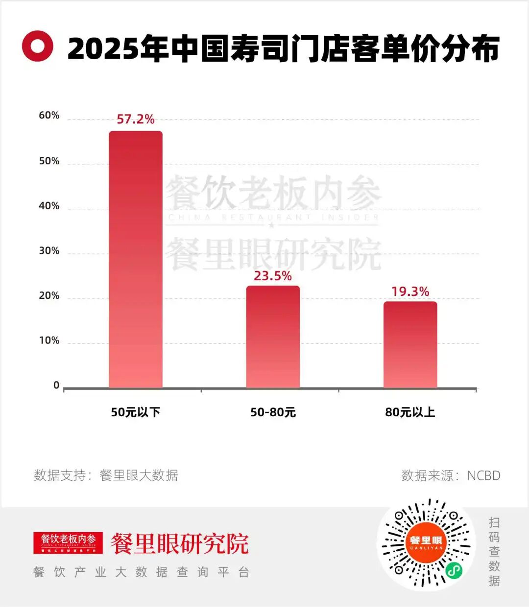 公开数据显示,现在国内寿司店中,人均50元以下的门店占比高达57.2%。虽然大家对寿司的印象还停留在“高端、食材好”,但实际上,大部分普通人鲜少会去吃人均500元或千元以上的精致Omakase寿司,更多时候还是会选性价比高的平价寿司。
