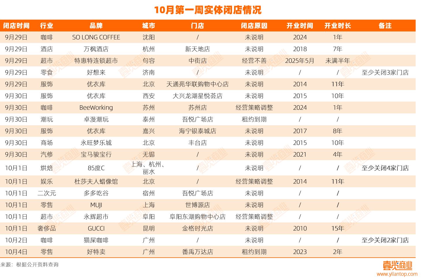 据壹览商业不完全统计,10月第一周,共17个品牌关闭了至少25家门店。