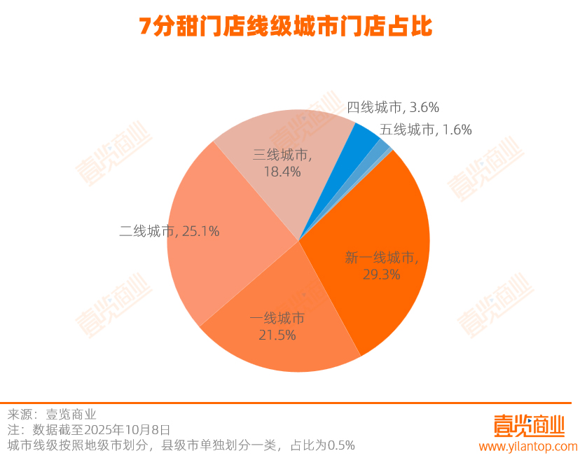 对比2025年8月,7分甜在下沉市场已出现初步拓展信号,但节奏仍偏缓。今年9月,7分甜的二线城市门店数达161家,占比25.1%,较8月提升0.7个百分点;三线及以下城市合计占比约24.1%,仍处低位。