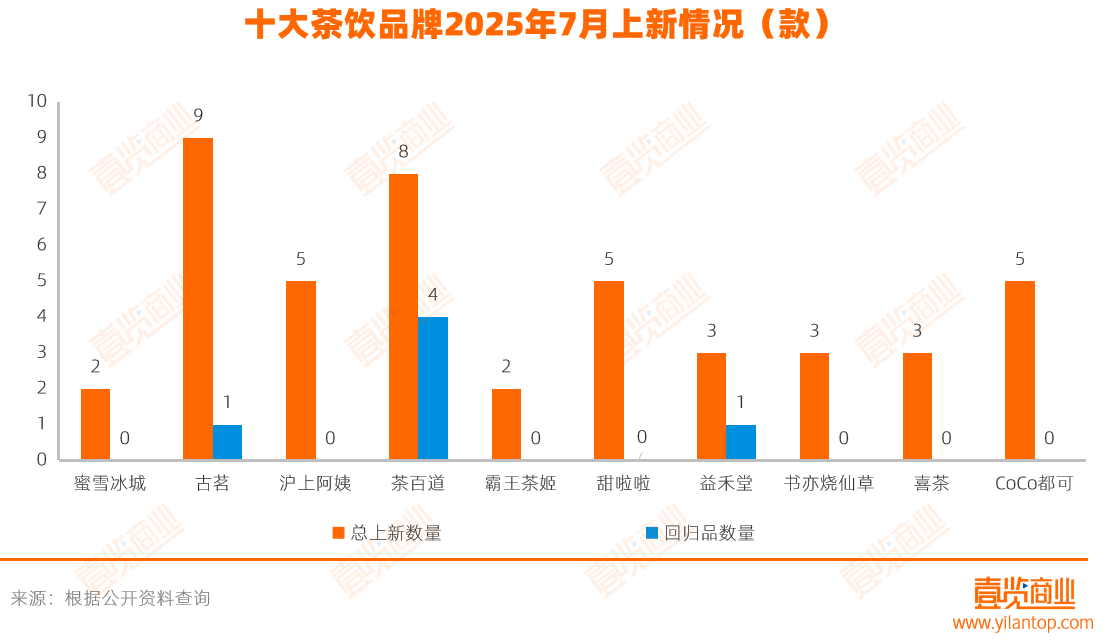 据茶咖观察统计,今年7月,全国门店数量TOP10的茶饮品牌共推出了45款新品,平均每天上新1.4款产品,其中包含6款回归品和39款真正意义上的新品。