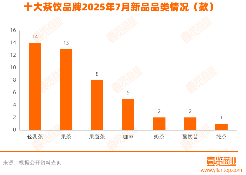 轻乳茶数量最多,共14款。相比6月多出3款,反映出消费者对兼具奶香与茶味的轻负担茶饮需求持续提升。其次,果茶品类仍是各大品牌布局的重点,共13款新品;且多于月初集中上市,以迎合天气转热带来的解渴需求。其中,茶百道上新4款果茶,沪上阿姨、古茗、益禾堂、甜啦啦各推出了2款果茶新品,霸王茶姬上新1款。