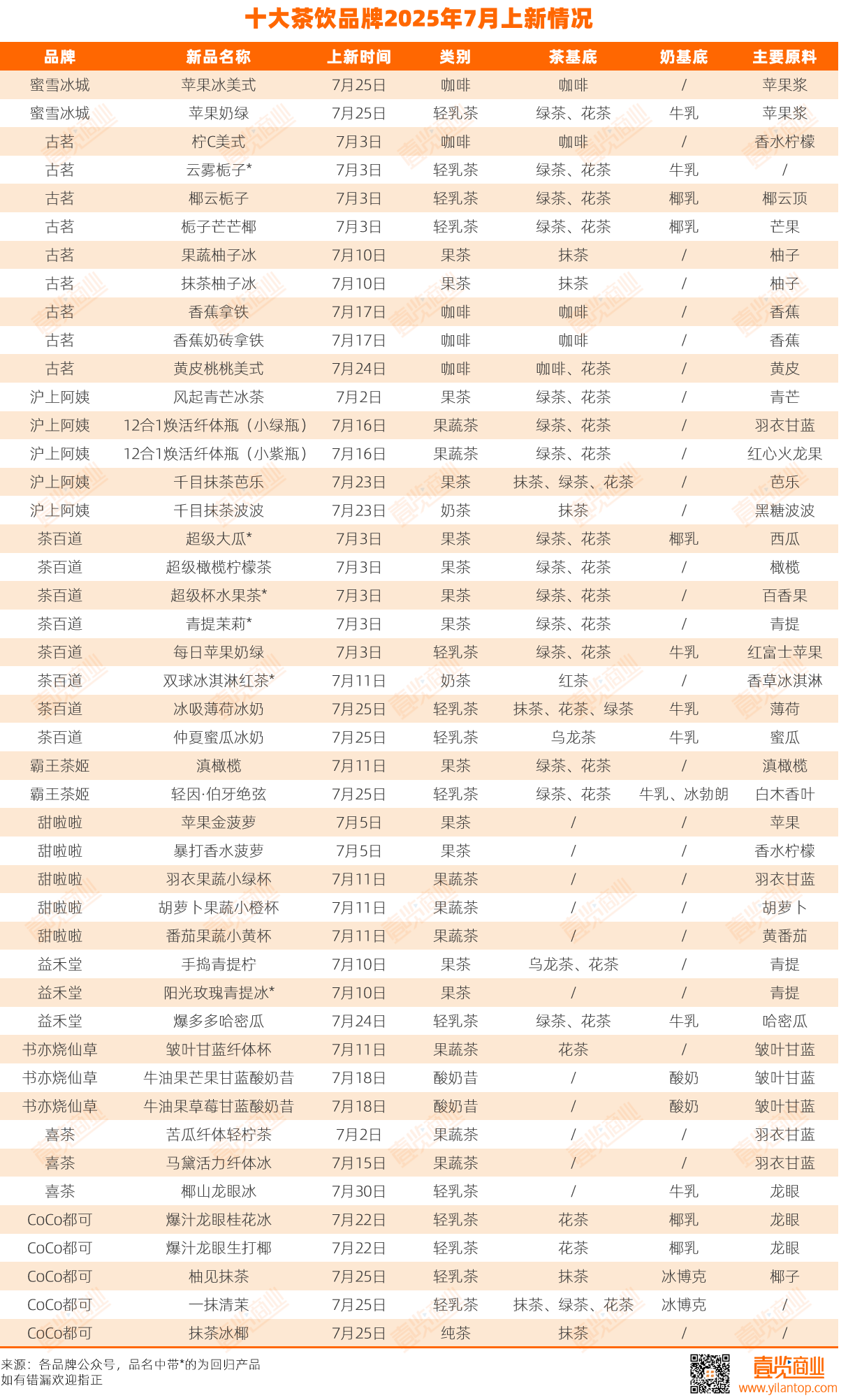 近日,茶咖观察统计了门店排名前十的茶饮品牌,2025年7月的新品上新情况。结果显示,对比6月,品牌上新数量虽有所减少,但依旧保持较高的活跃度,旺季创新动能持续释放。