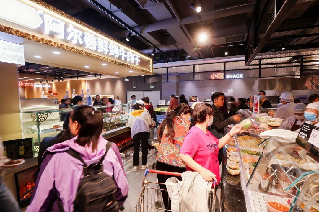 本次焕新,虽然加工类别面积占总面积的22%,但占到了生鲜面积的50%以上,大部分产品为自营加工,每天采购鲜肉,分割出加工所需的部位操作间直接烹制,即保证了熟食原料的新鲜,也使原料物尽其用,降低了肉品的损耗。为了让顾客能够享受到更具参与感,专门设置了堂食区,民盛店的堂食区,比常见的堂食区做了升级,不仅可以购买加工成品在此进食,还可为顾客简单烹制店内购买的蔬菜、肉品等,用“锅气”将顾客变成家人。