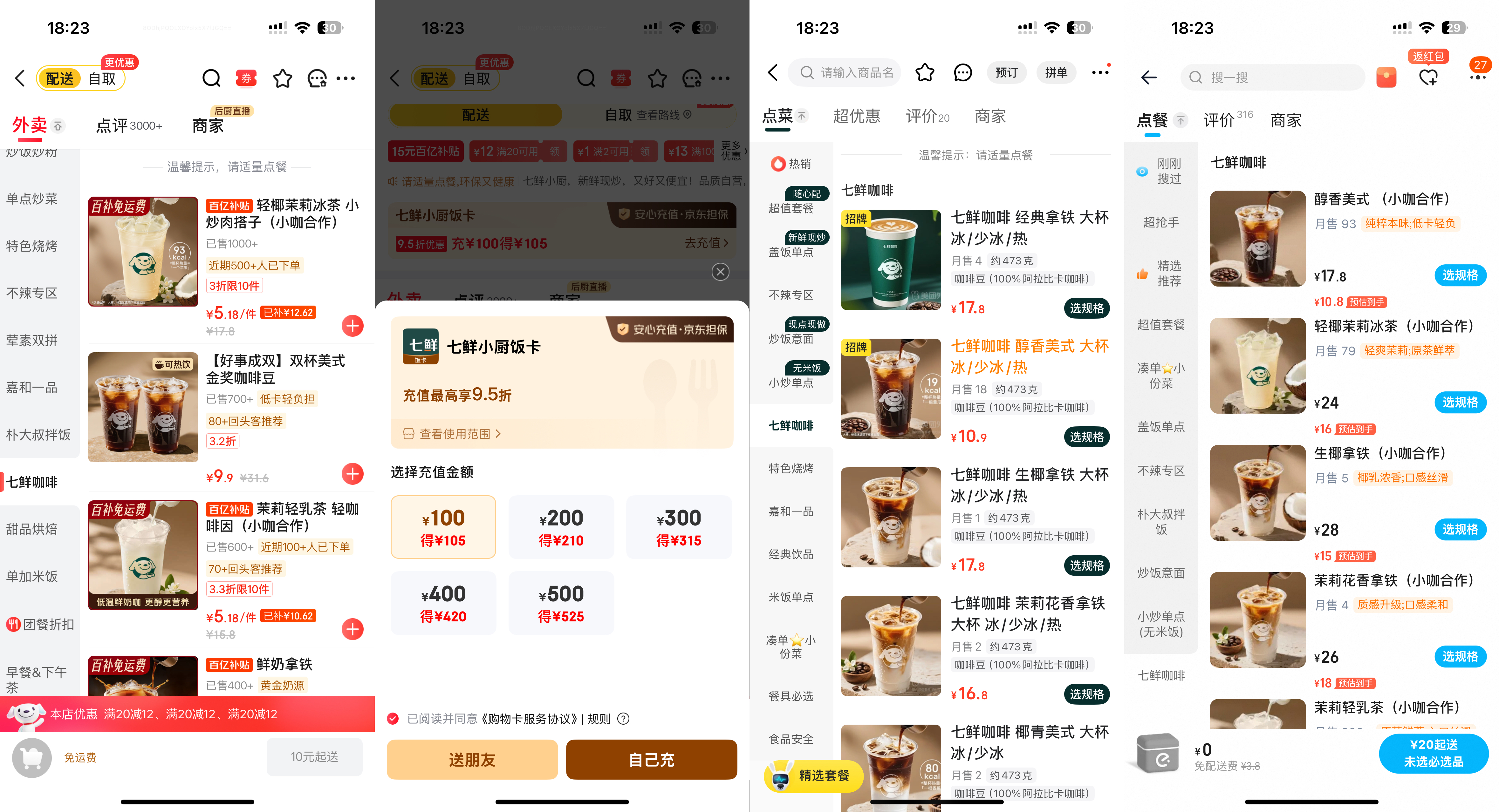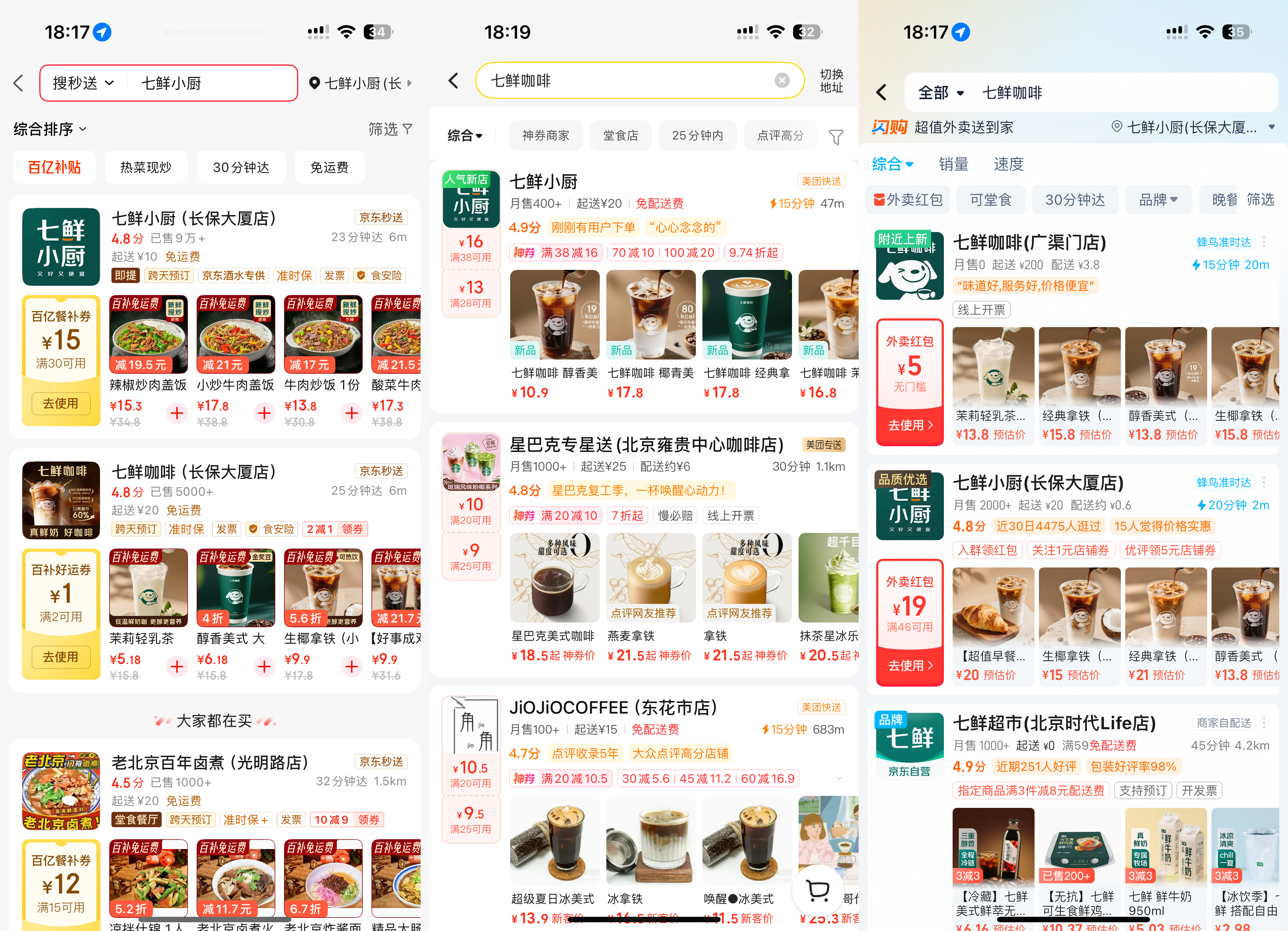 从左至右分别为:京东外卖、七鲜小厨饭卡、京东美团外卖、淘宝闪购