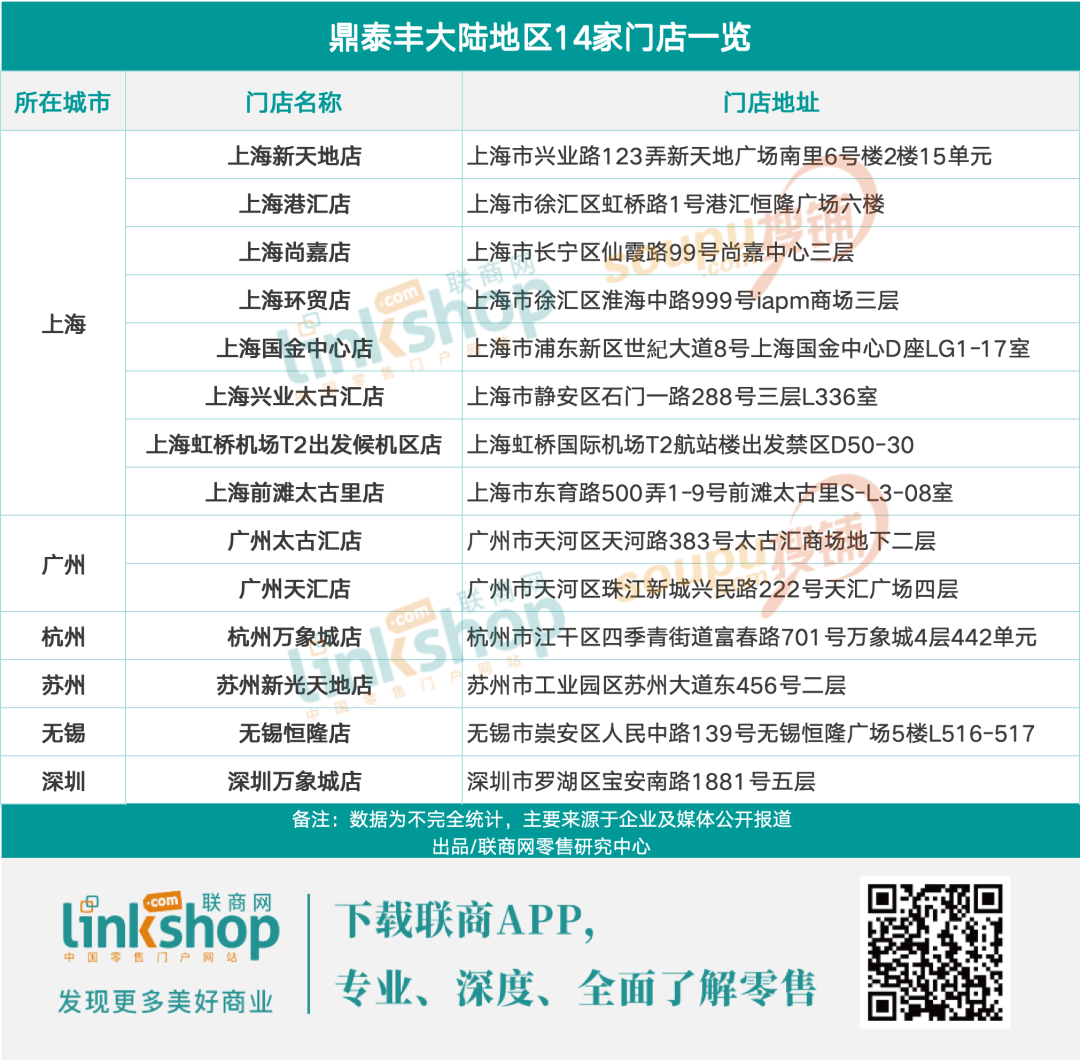官网资料显示,目前鼎泰丰在大陆地区的门店仅剩下14家。其中,上海有8家,广州有2家,杭州、无锡、苏州和深圳各有一家门店。
