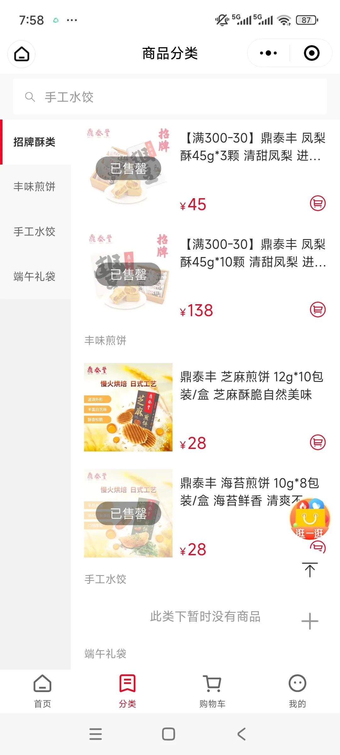 联商网查询鼎泰丰微信商城发现,目前该商城仅有一款芝麻煎饼可供出售,其余涵盖面点、预制菜、周边等品类的商品均标注“售罄”。