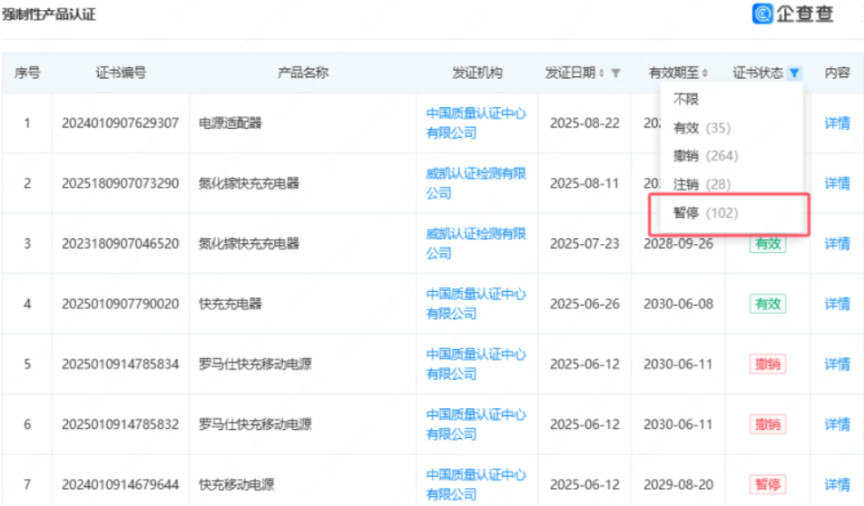 罗马仕多个快充移动电源3C证书状态变更为“撤销”