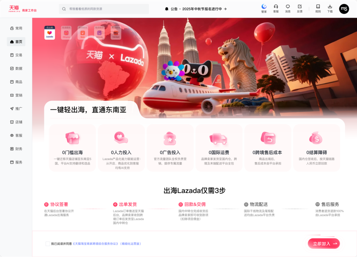 当订单产生的时候,天猫商家只要发货到国内中转仓,Lazada将负责后续的跨境运输和售后,全程无需注册、无需组建海外团队。