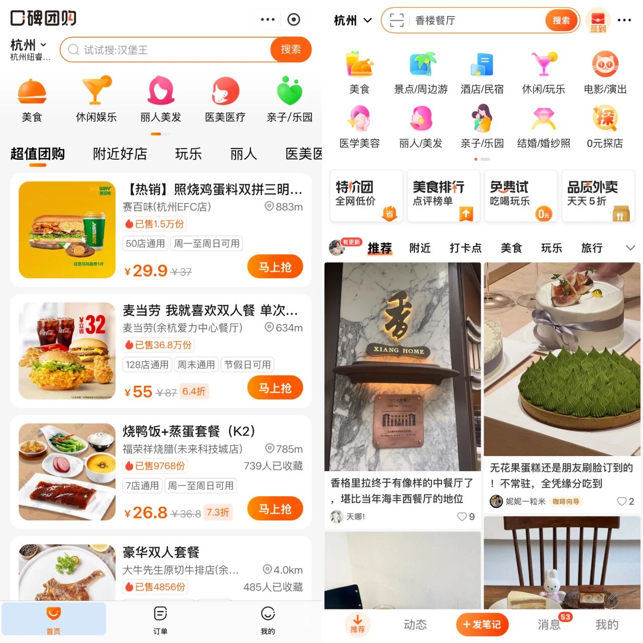 大众点评因为依靠海量的用户评价、商户评分和达人探店内容构建消费决策链,形成了强社交属性的团购生态。页面也有一半的图文内容。