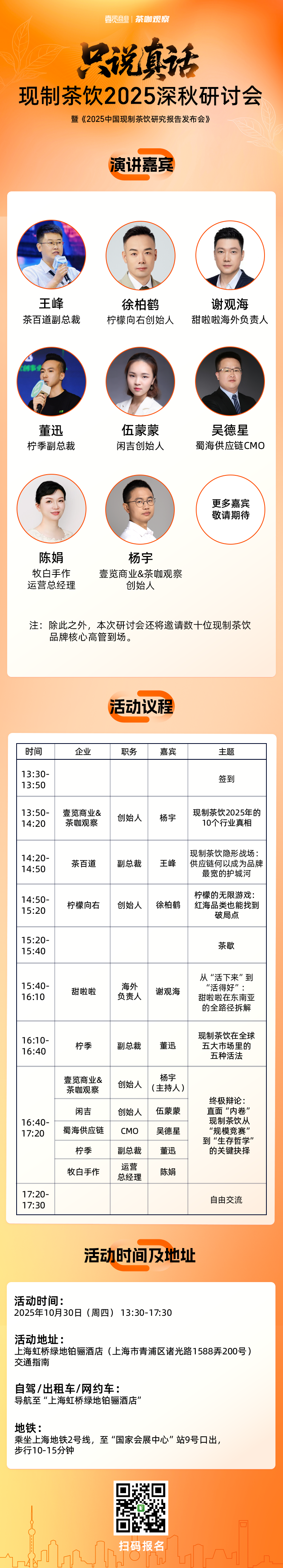 10月30日,壹览商业&茶咖观察将上海举办一场主题为“只说真话”的现制茶饮行业闭门研讨会,王峰已受邀参与并将发表主题为“现制茶饮的隐形战场:供应链何以成为品牌最宽的护城河?”的演讲。届时,他将在现场分享: