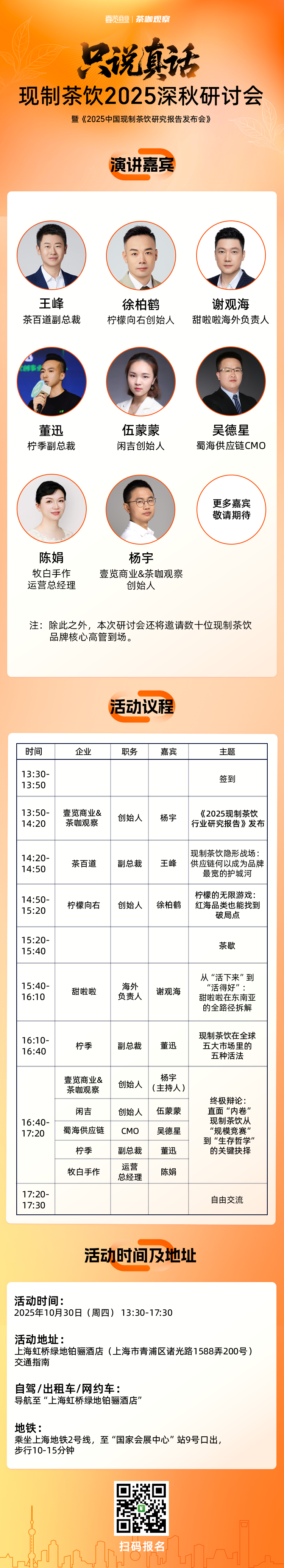 除了徐柏鹤之外,我们还邀请了茶百道供应链负责人、柠季副总裁董迅、闲吉创始人伍蒙蒙、甜啦啦海外事业部负责人谢观海、牧白手作总经理陈娟、蜀海供应链CMO吴星……为了保证分享足够“干货”,我们将给足每位嘉宾时间,让他们畅所欲言。