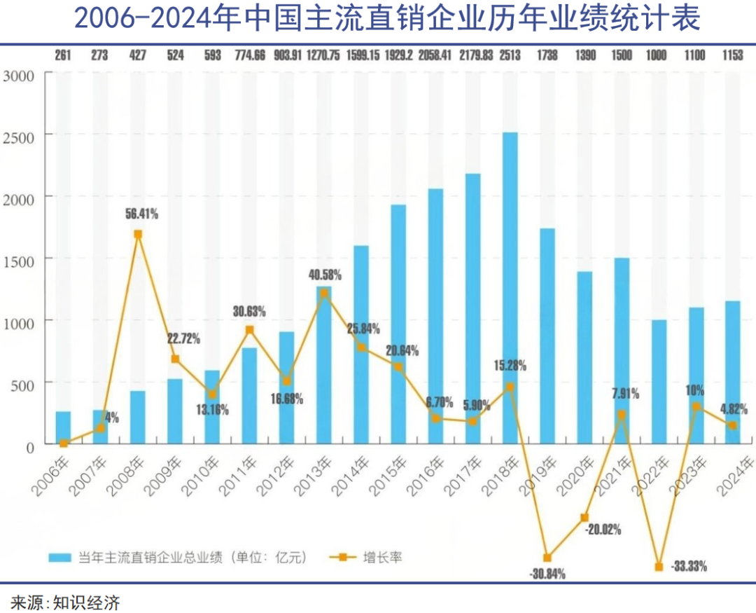 整体而言,2024年87家直销企业总业绩为约1153亿元,相较于2023年的1100亿元上升4.82%,但是相较2018年,已经腰斩有余。