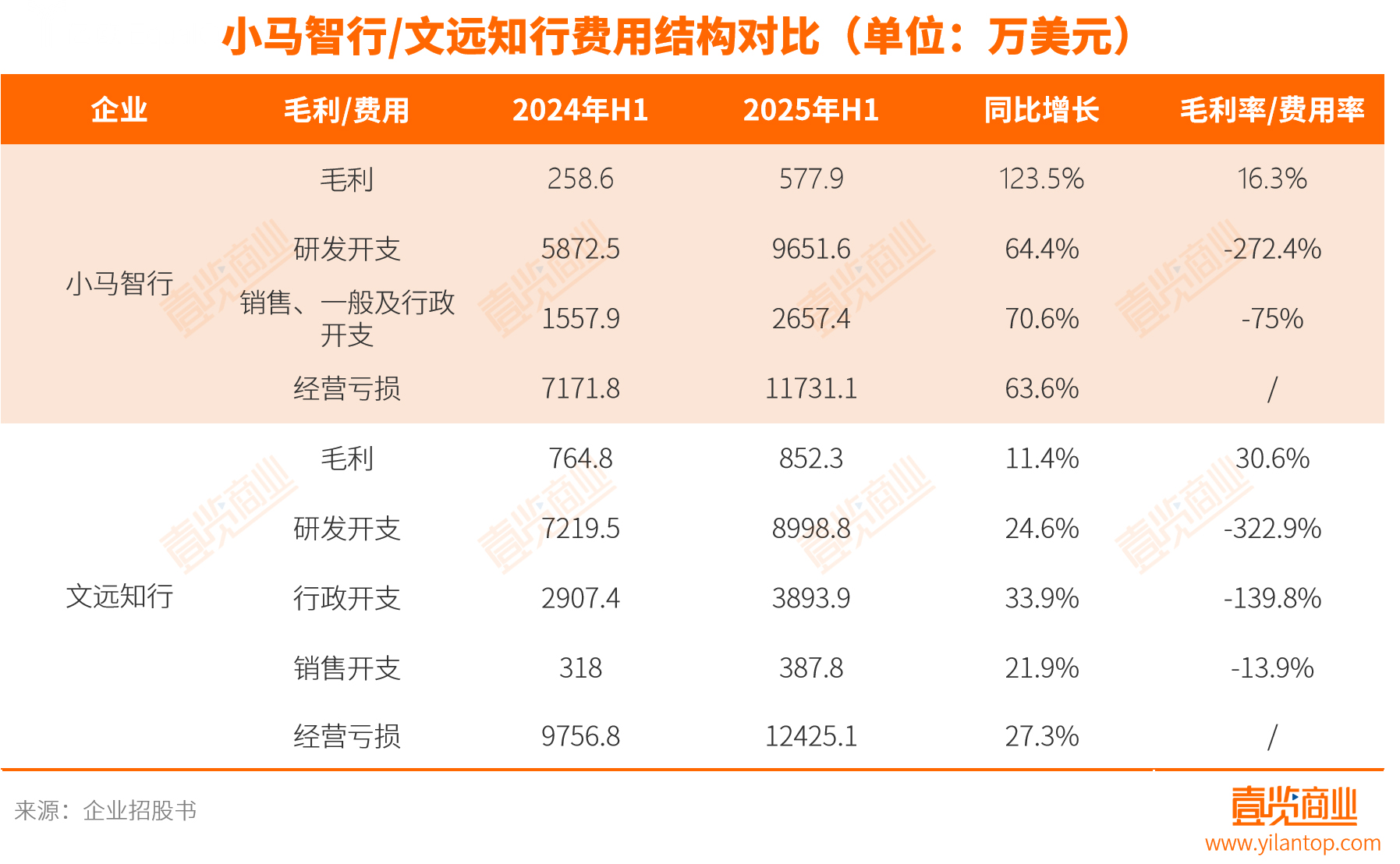 2025年上半年,小马智行研发支出达 9651.6 万美元,同比增长 64.4%;文远知行研发支出为 8998.8 万美元,同比增长 24.6%。研发费用占营收比例分别高达 272% 和 323%,也就是说,两家公司赚一美元,要花三美元去做研发。