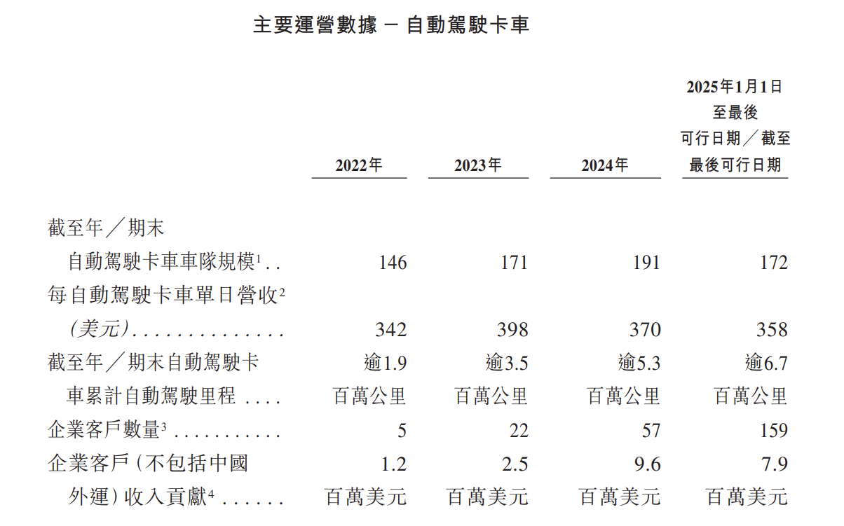 从经营数据看,两家公司想表达的重点也截然不同。小马智行的披露极为细致:不仅拆分Robotaxi与卡车的车队规模、单车日营收、累计无人化里程,还细化至自营与第三方租赁比例、商营与测试车数量等。