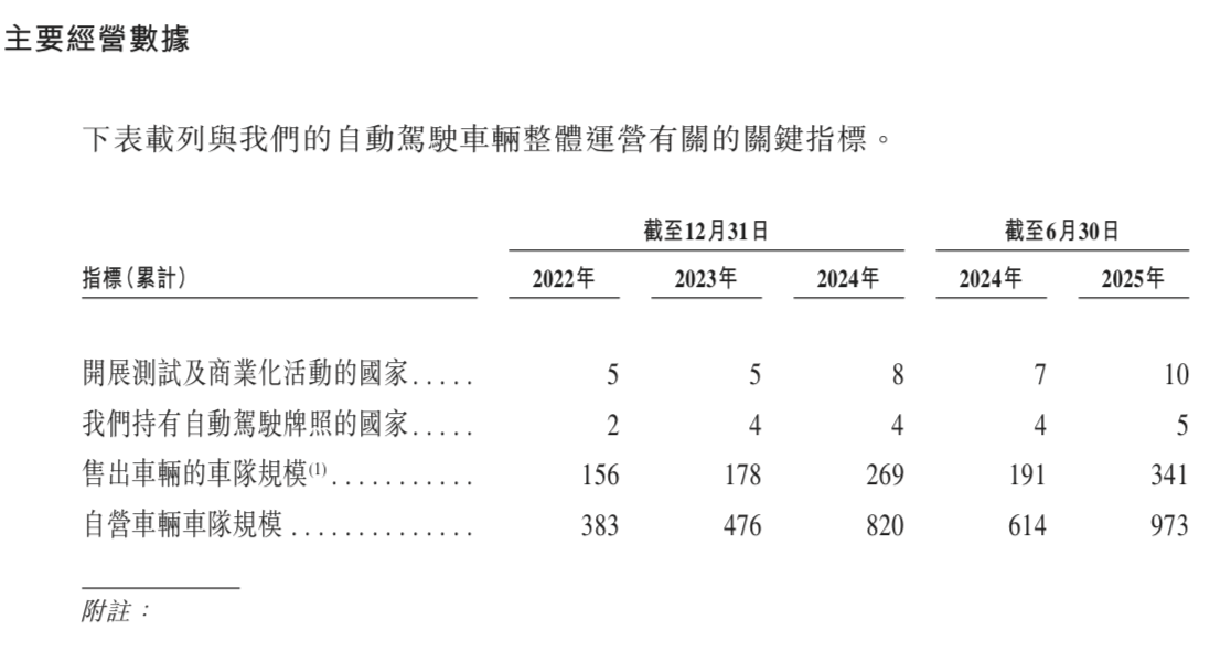文远知行重点展示其持有牌照的国家数、商业化活动国家数、售出车辆和车队规模,以体现其国际化优势。到2025年上半年,文远自营车队达到973辆,售出车辆341辆,测试及商业化活动覆盖10个国家,拥有自动驾驶牌照的国家增至5个,其Robotaxi板块在半年内增长385%,不仅得益于国内放开的商用城市,更源自中东市场的运营试点。