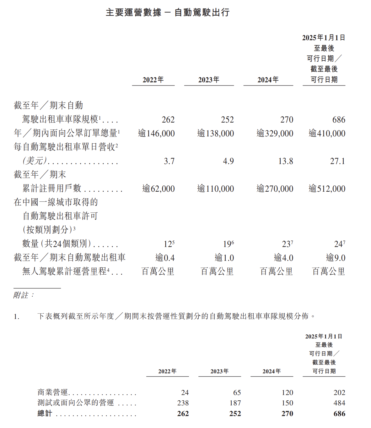 招股书显示,小马智行Robotaxi车队在2025年已增至686辆,年内面向公众订单约41万单,单车日营收从2024年的13.8美元跃升至27.1美元,几乎翻倍;无人化运营里程累计达900万公里,一线城市许可类别扩展至24类。这样的增长说明小马在稳步扩大商业化区域、提高有效计费时长的同时,也在提升无人化比例。