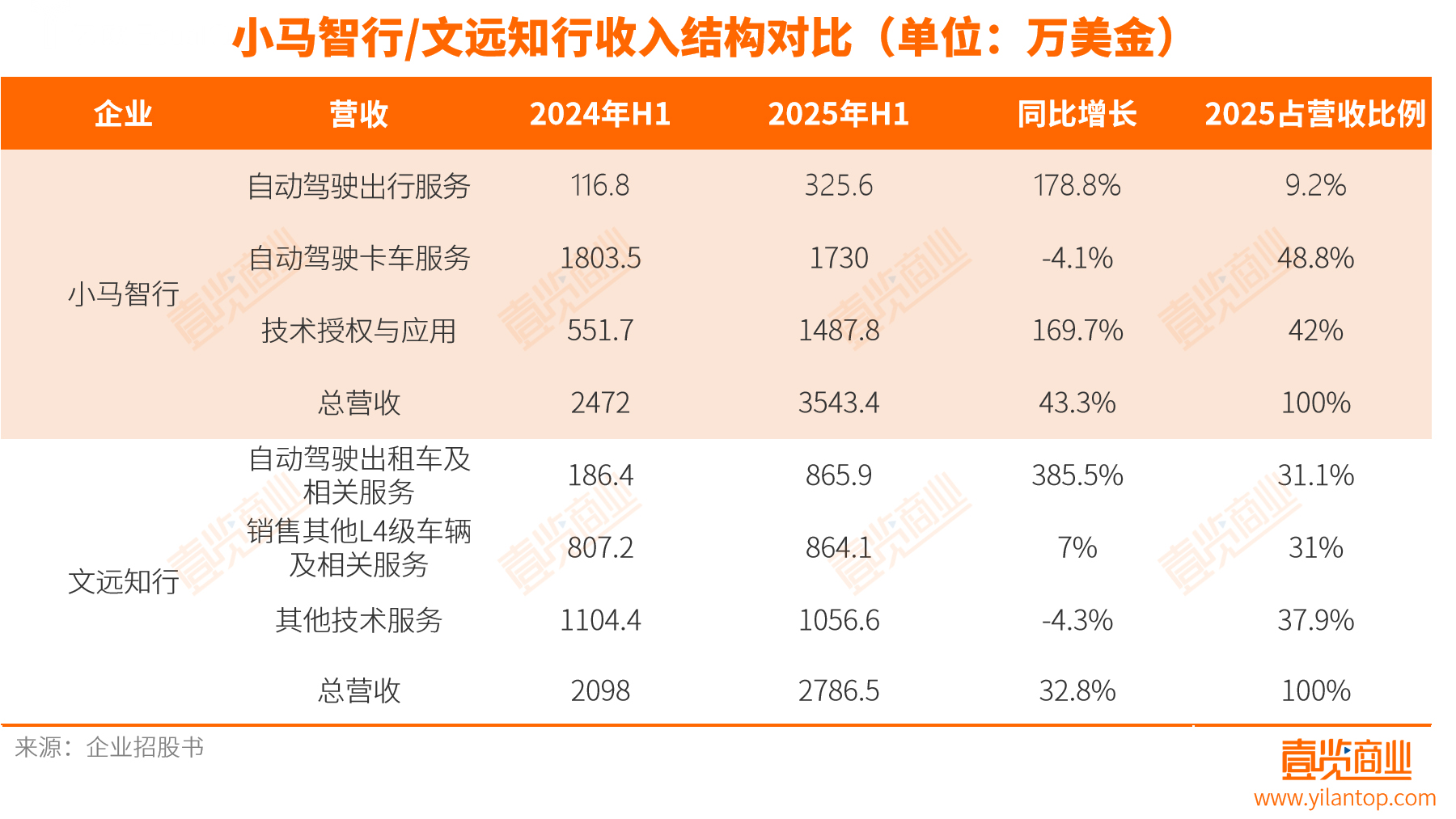 相对地,文远知行的营收结构更加均衡。2025年上半年,总营收为2786.5万美元,同比增长32.8%。其中,自动驾驶出租车及相关服务售出865.9万美元,暴增385%,贡献了31.1%的营收;L4级车辆销售及相关服务(包括小巴、货车等)占比31%,保持平稳;其他技术服务贡献37.9%,略有下降。