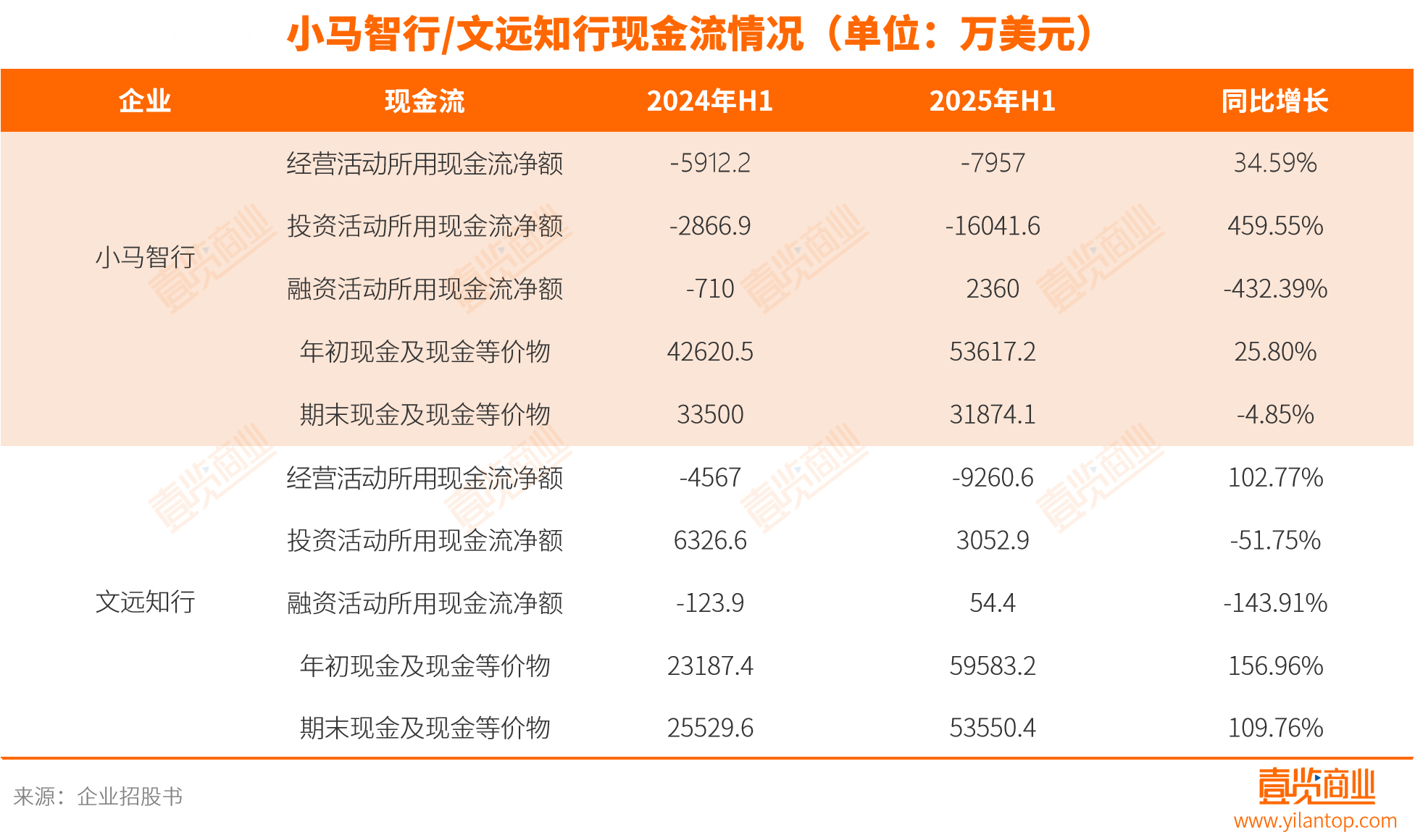 相比之下,文远知行的现金流结构更“轻”。2025年上半年,其经营活动现金流净流出9260万美元,同比虽翻倍,但投资活动现金流净流出仅3053万美元,同比反而下降51.7%。这说明文远在资产扩张上明显更谨慎。