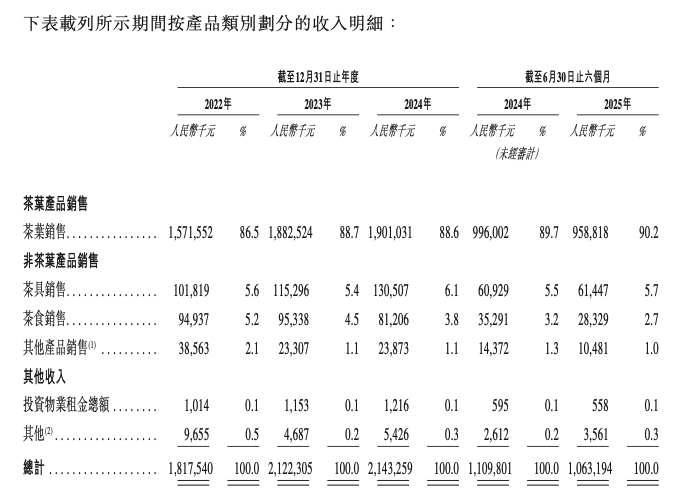 从收入结构上看,八马茶业的核心产品是茶叶。八马茶业的产品组合主要包括茶叶产品、茶具及茶食,报告期内,茶叶产品销售贡献的营收占比分别为86.5%、88.7%、88.6%、90.2%。