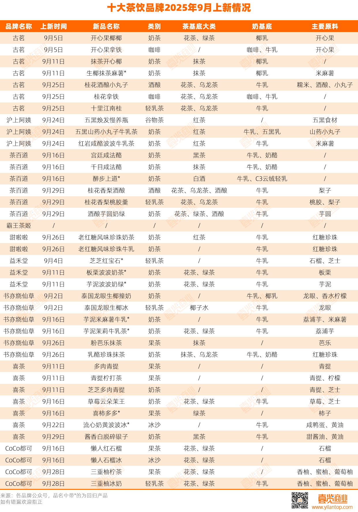 茶饮品牌中,古茗和喜茶在9月并列上新数量榜首,各自推出7款新品;茶百道和书亦烧仙草紧随其后,均上新6款。整体来看,主流茶饮品牌在秋季仍保持较密集的产品更新节奏。