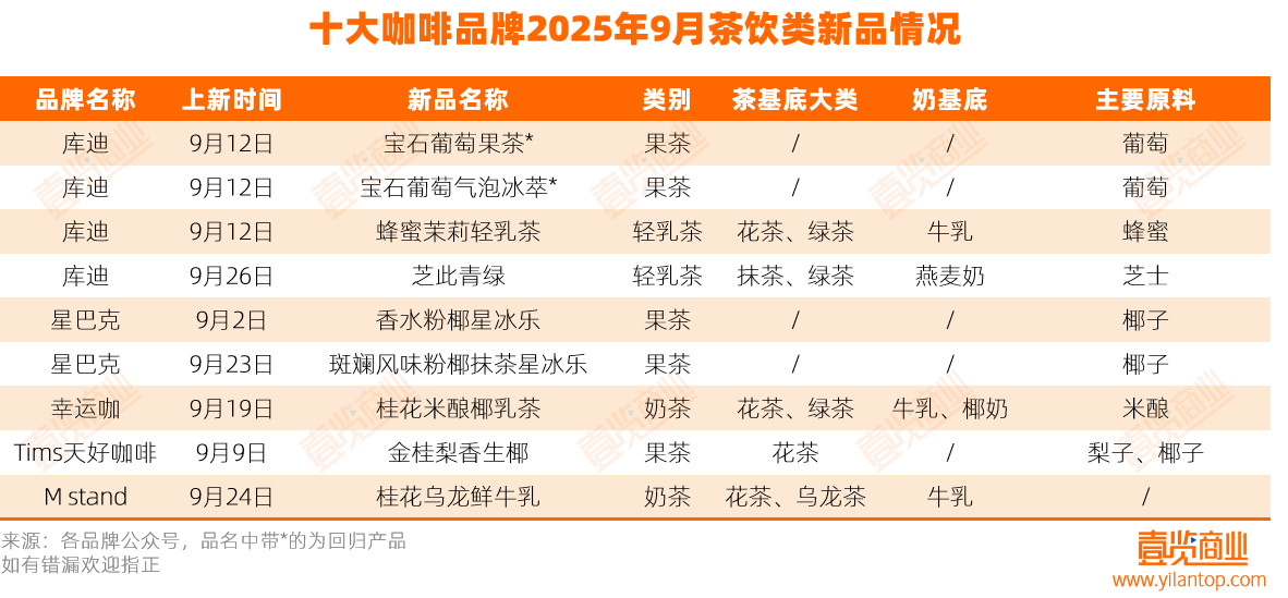 专业咖啡品牌也在加速布局茶饮领域,9月共由5个咖啡品牌上新9款茶饮类产品,其中库迪推出4款,占其9月新品总数的80.0%;星巴克上新2款星冰乐;幸运咖、Tims天好咖啡与M stand各推出1款茶饮新品。
