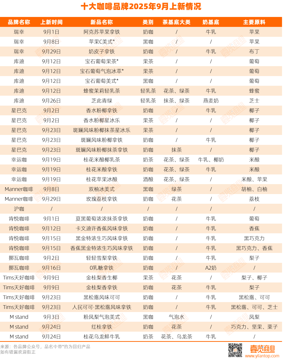 咖啡新品同样呈现出厚重化倾向,奶咖类产品成为推新重点。9月,咖啡品牌共推出17款奶咖新品,占当月咖啡新品总量的54.8%,同期果咖与黑咖的新品数量分别为5款和4款。