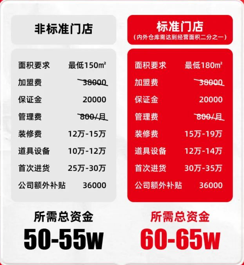 由于鸣鸣很忙2024年推出优惠加盟政策,出现0加盟费、免除管理费的情况,除去这些费用,另有保证金、装修费、设备费、首次进货费用,总计要50万至55万。如果水电、房租、人工等成本,费用只会更高。