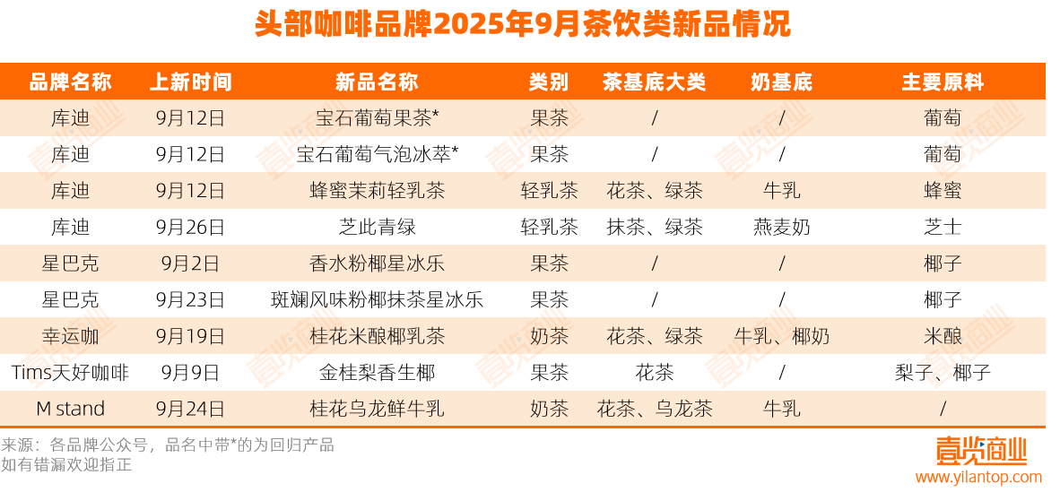 值得一提的是,咖啡品牌也在加速布局茶饮领域。据茶咖观察统计,9月,门店数量排名前十的咖啡品牌共上新9款茶饮类产品,其中库迪推出4款,占其9月新品总数的80.0%;星巴克上新2款星冰乐;幸运咖、Tims天好咖啡与M stand各推出1款茶饮新品。