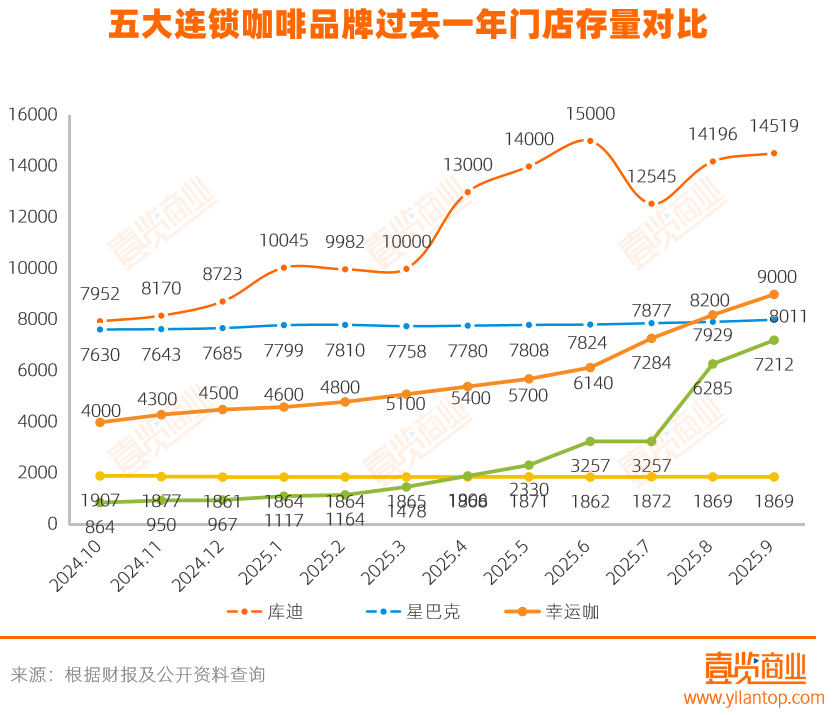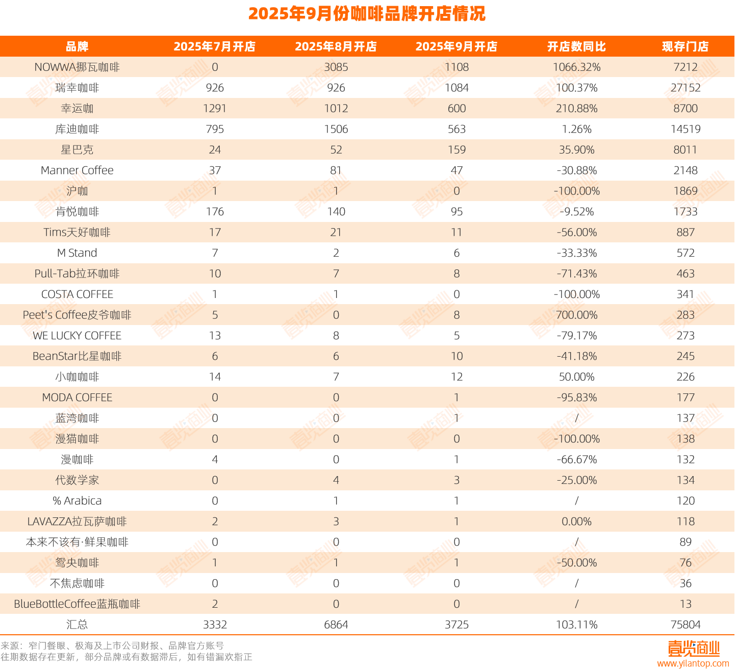 从个体动态看,部分品牌的拓店节奏出现明显变化。星巴克在本月新增159家门店,环比增长205.77%,显示出其重启积极扩张的策略;库迪咖啡则在9月新开563家门店,相比8月减少943家,降幅达62.61%,增速明显放缓;而幸运咖9月新增600家,相较前两个月上千家的规模,节奏略有收敛。