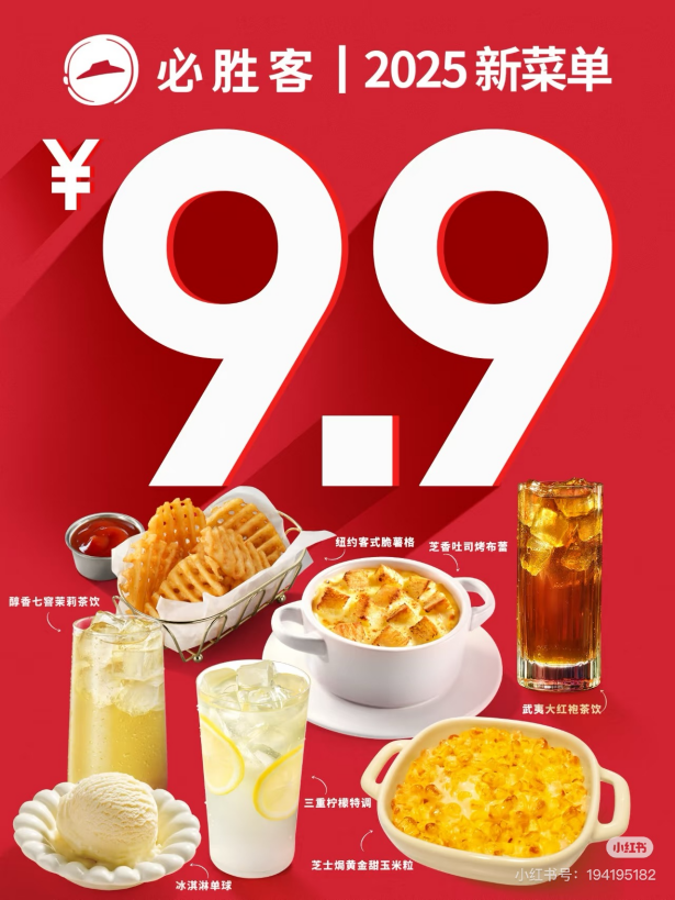 在西餐里,麦当劳在今年开启“2025超值年”,推出“随心配1+1”等优惠套餐;汉堡王推出每周三“9.9元,小食1+1”活动;必胜客开出“Pizza Hut Wow 乐享店”,宣布进入平价西餐赛道,10月还推出“9.9元全新菜单”;正新鸡排也跨界做起汉堡,“3个汉堡只需9.9元”。