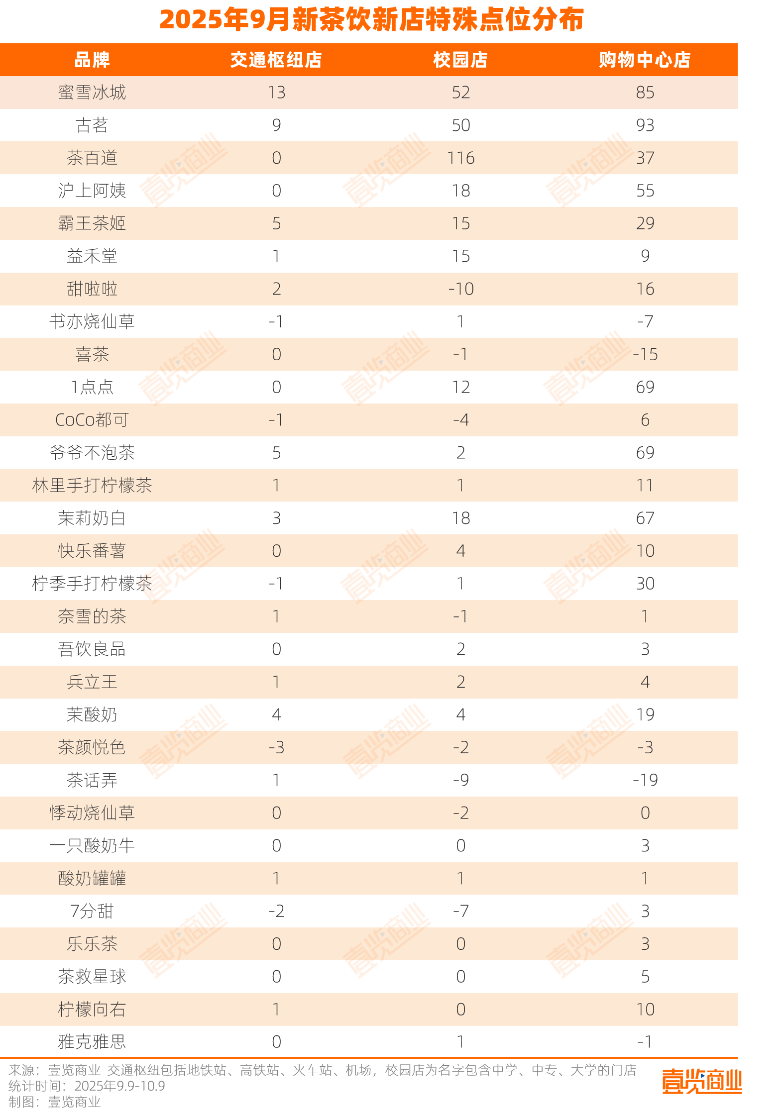 从9月的特殊点位分布来看,新茶饮品牌正在加速场景化布局。数据显示,校园与购物中心成为两大核心增长点。茶百道当月新增116家校园店,稳居行业首位;古茗、蜜雪冰城紧随其后,分别新开50家与52家校园店,凸显品牌对年轻消费力的重视。