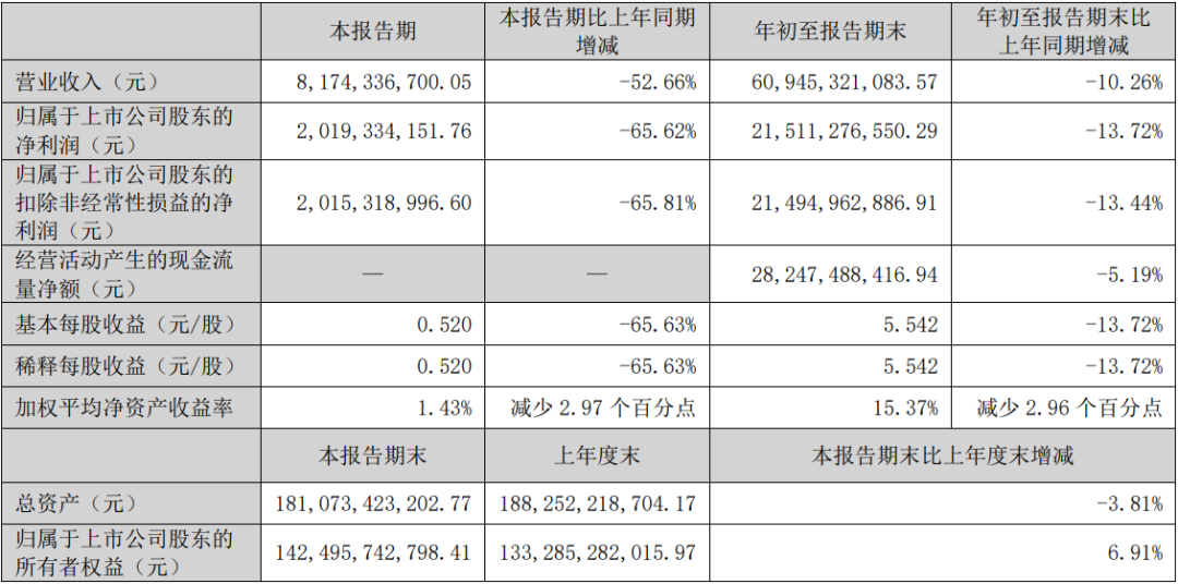 今年前三季度,五粮液实现营收609.45亿元,同比减少10.26%;归母净利为215.11亿元,同比减少13.72%。其中第三季度营收和归母净利更是双双腰斩,这也是其近20年(2006年以来)单季度业绩最大跌幅。