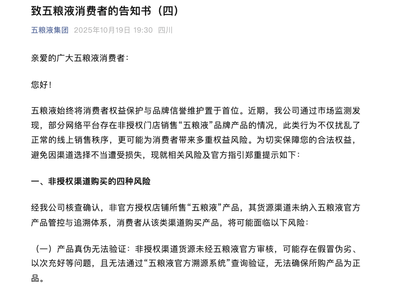 去年11月至今,五粮液就在8个月内三次发布《致消费者的告知书》,指出电商平台“百亿补贴”下存在的“假货风险”,对其品牌形象产生了巨大影响。