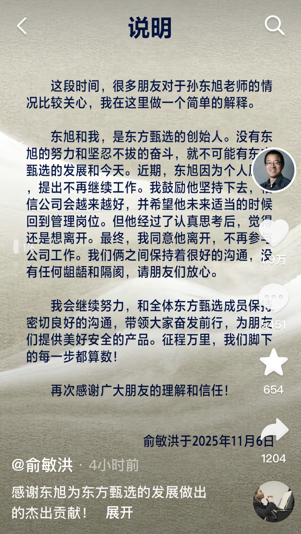 11月6日下午,新东方创始人俞敏洪在个人社交媒体账号发文,确认了前东方甄选CEO孙东旭的离职。