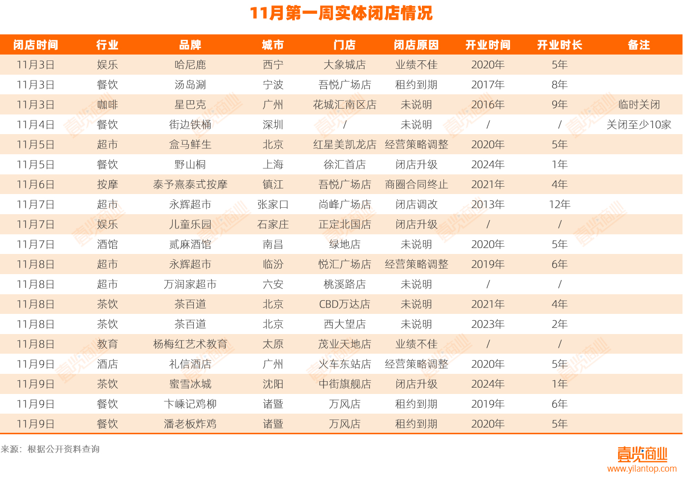 据壹览商业不完全统计,11月第一周,共16个品牌关闭了至少28家门店。