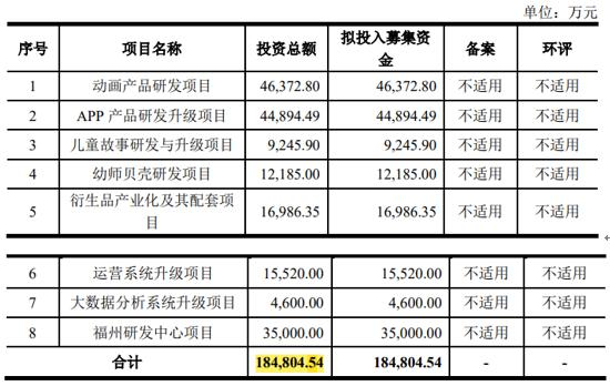 而在2021年,宝宝巴士也曾冲刺上市。深圳证券交易所曾披露了宝宝巴士股份有限公司(以下简称宝宝巴士)的招股说明书,从上市募资用途看,宝宝巴士彼时押注IP,即熊猫兄妹奇奇和妙妙(英文名为KiKi和MiuMiu)、小宝宝超级宝贝JoJo(英文名Super JoJo)和猴子探长。宝宝巴士拟募集的18.48亿元资金中,约有10亿元将用于产品内容研发;与此同时,约有1.7亿元将用于衍生品产品化及配套项目。