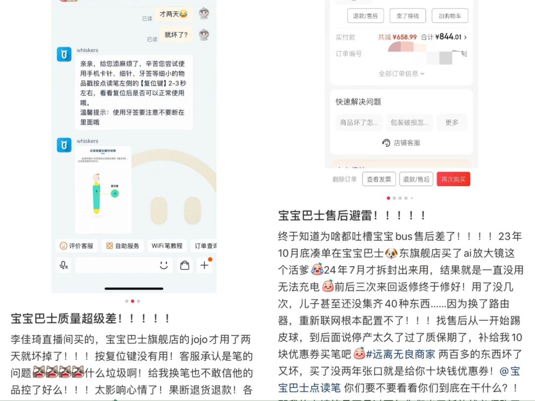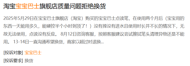 而宝宝巴士的点读笔,也被多位消费者指出质量差等问题。不少网友提到,“才用了两天就坏掉了,按复位键也没有用”“2024年8月份给娃买了,11月份因为充电口充不进电返厂维修过一次,今年8月份发现又坏了……”