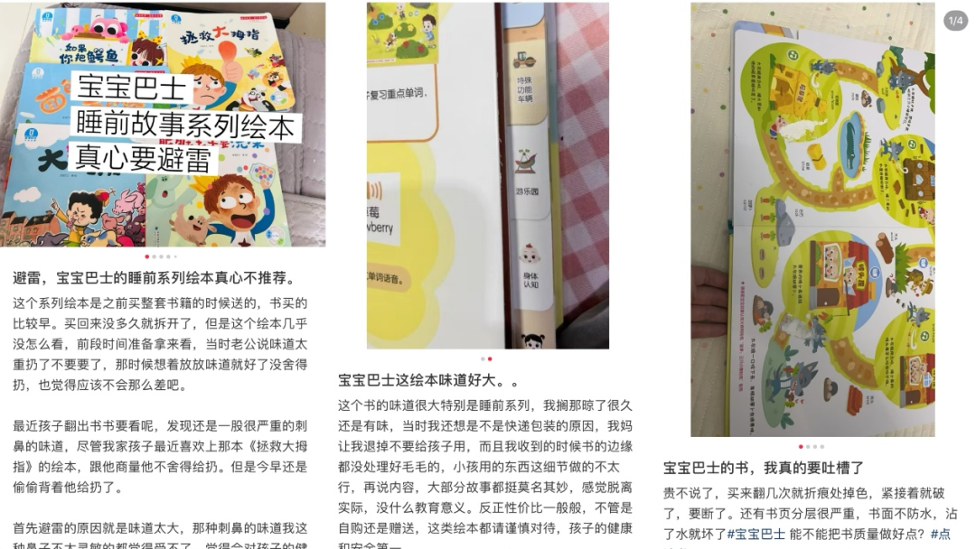 在小红书、微博等社交平台上,有不少家长提及宝宝巴士绘本的质量问题。其中,有网友在小红书上发布笔记称,自己购买的宝宝巴士的绘本味道很大,“特别是睡前系列,我搁那儿晾了很久还是有味……而且我收到的时候书的边缘都没处理好,毛毛的,小孩用的东西这细节做得不太行……不管是自购还是赠送,这类绘本都请谨慎对待,孩子的健康和安全第一。”