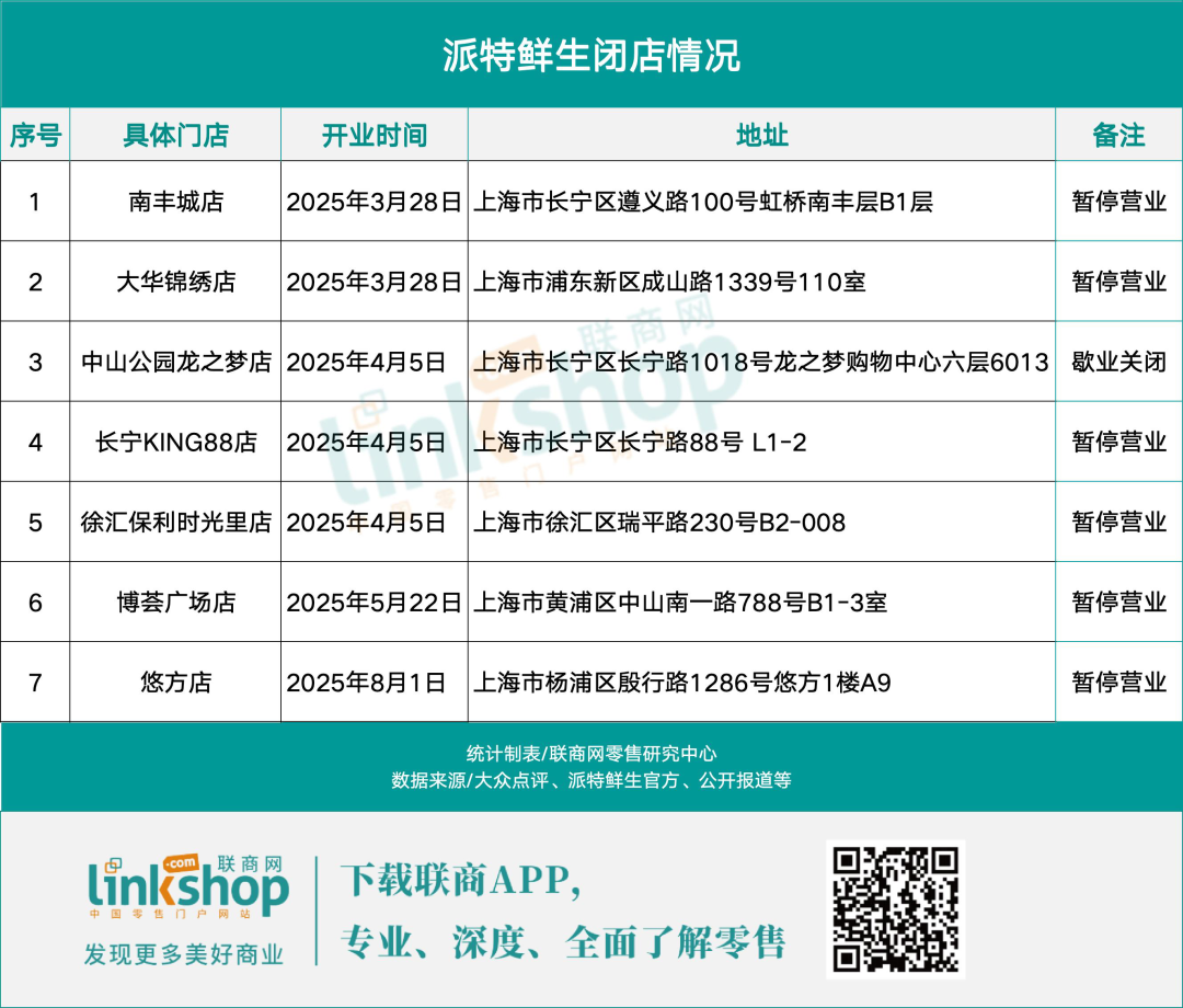 大众点评信息显示,派特鲜生18家门店中,7家已显示“暂停营业”或“歇业关闭”,其中不乏有开业仅3个多月的新店。