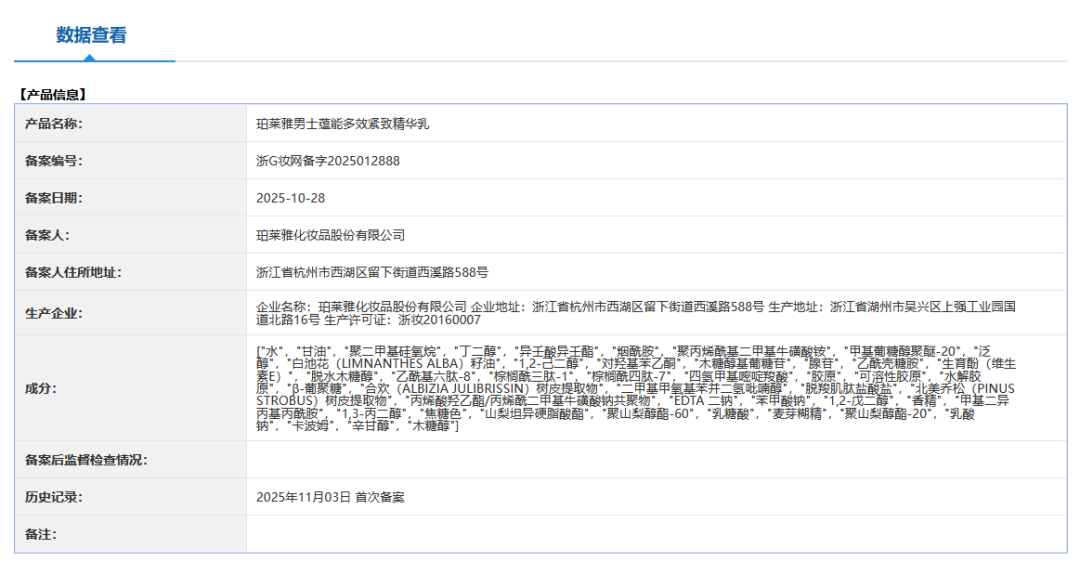 ▍珀莱雅男士蕴能多效精华乳 截自国产普通化妆品备案信息平台