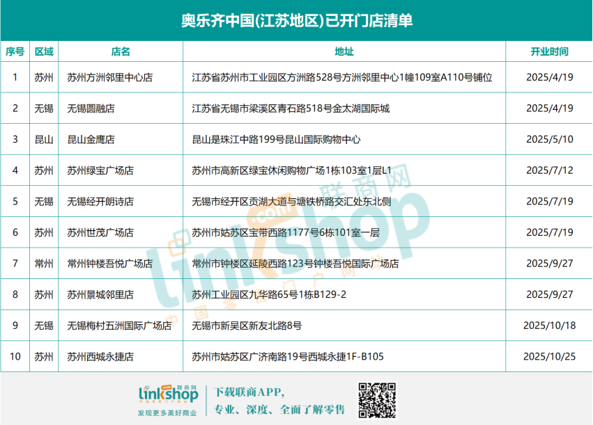 经过6年多的发展,截至2025年10月底,奥乐齐中国市场门店总数达到80家,覆盖上海及江苏多地(苏州、无锡、昆山、常州)。而在江苏,奥乐齐目前已有10家店开业。