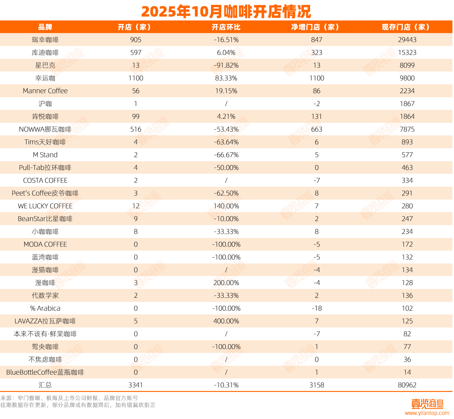 10月,壹览商业长期跟踪的27家连锁咖啡品牌共新开3341家门店,环比减少10.31%,同比增长94.47%。总门店数突破8万家,共计80962家,环比净增3158家,增长率为4.06%,整体规模持续扩大。