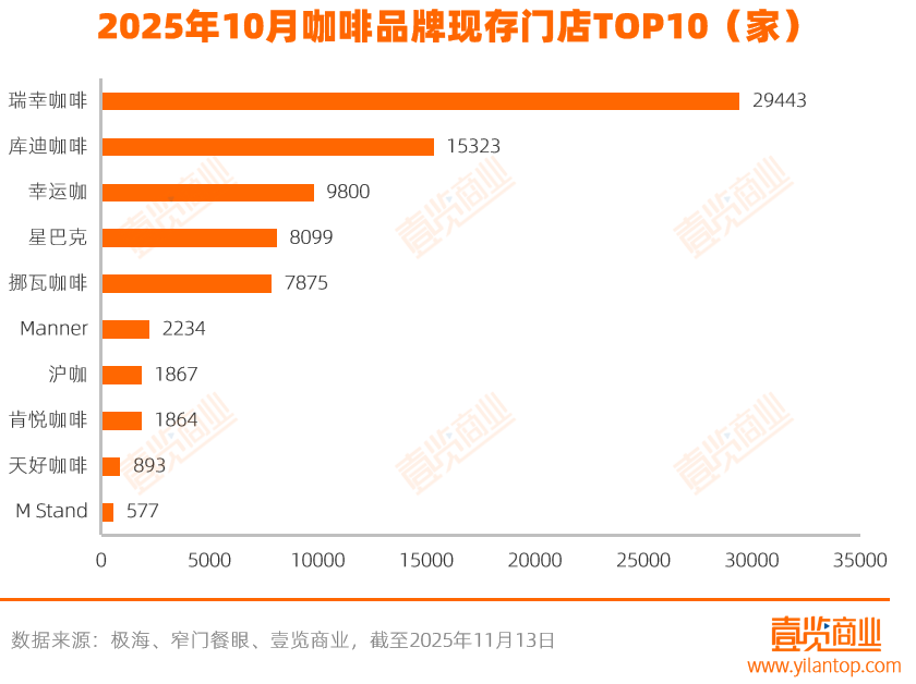 星巴克保持约8000家门店;NOWWA挪瓦咖啡现存7875家,壹览商业数据显示,截至2025年11月3日,其寄生店数量达7235家,占该品牌全国门店总数的91.9%。除Manner、沪咖及肯悦咖啡维持在2千店上下水平,其余品牌门店数量均未超过1000家。