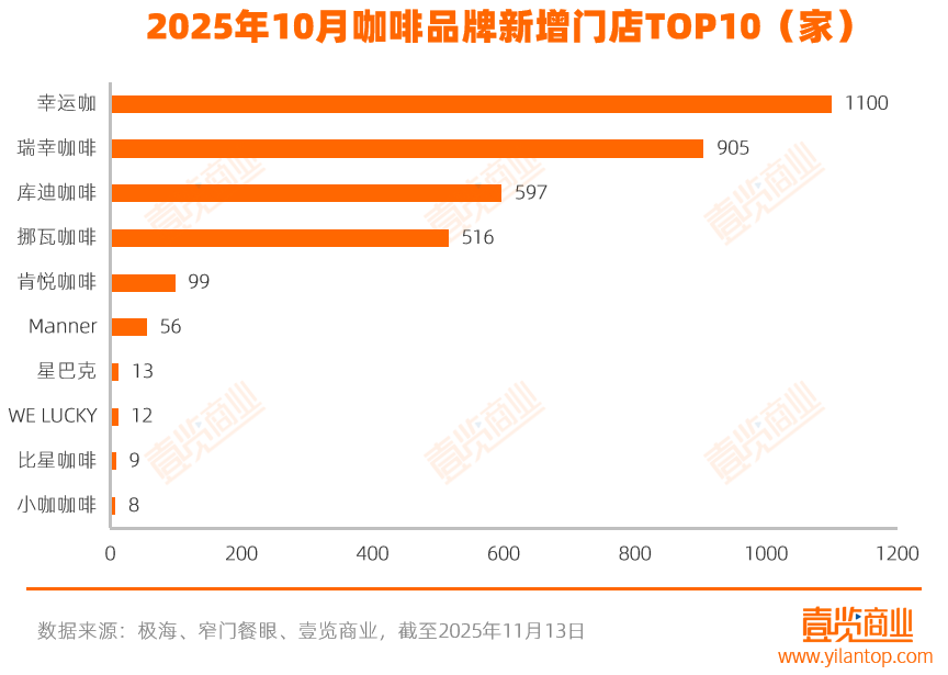 从新开门店看,幸运咖、瑞幸、库迪和挪瓦咖啡四家品牌合计贡献了93.09%的新增门店。其中,幸运咖单月新增1100家,占比超过三分之一,成为当月拓店主力。瑞幸咖啡紧随其后,单月新增905家;库迪咖啡与NOWWA挪瓦咖啡则分别新增597家和516家。