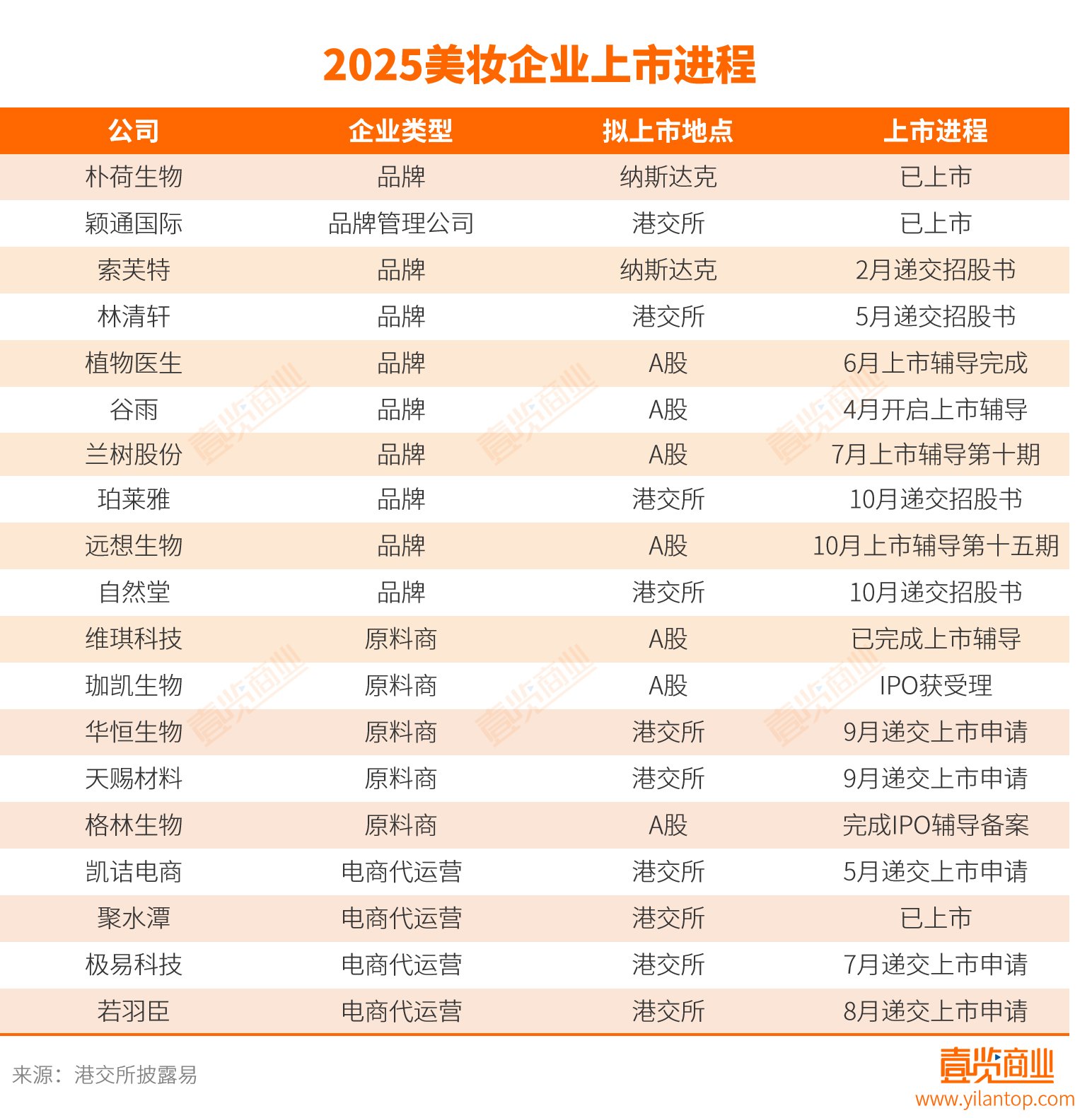 壹览商业统计发现,2025年以来,共有20家国货美妆相关企业启动上市进程,涵盖品牌方、原料供应商、电商代运营公司等多个类型。其中,约一半企业选择港交所作为主要申报地,其余则奔赴A股或美股市场。