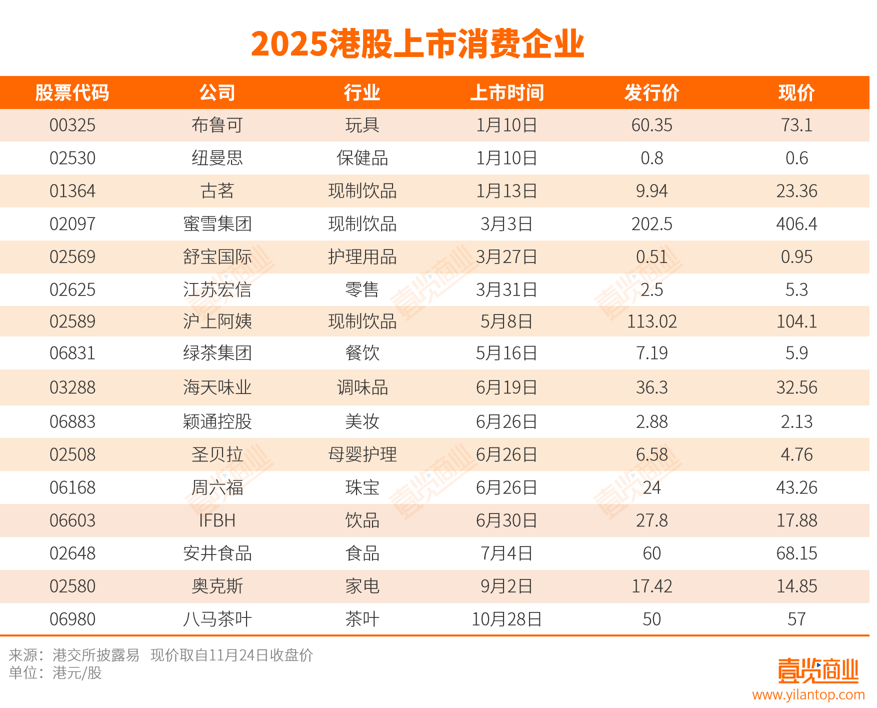 根据普华永道数据,2025年上半年港股新上市公司中,零售、消费品及服务类占比高达34%。据壹览商业不完全统计,从年初至10月底,已有至少15家消费类企业成功登陆港交所,涵盖饮品、食品、母婴个护、调味品、餐饮零售等多个细分行业。