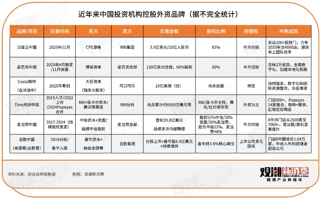 博裕资本收购星巴克中国60%股权,合资公司估值40亿美元;CPE源峰为汉堡王中国注入3.5亿美元,拿下83%控股权,中信资本将麦当劳中国持股增至52%。这些交易的背后,是中国资本对国际品牌价值的冷静重估:品牌遗产必须通过本土化改造才能重新变现。