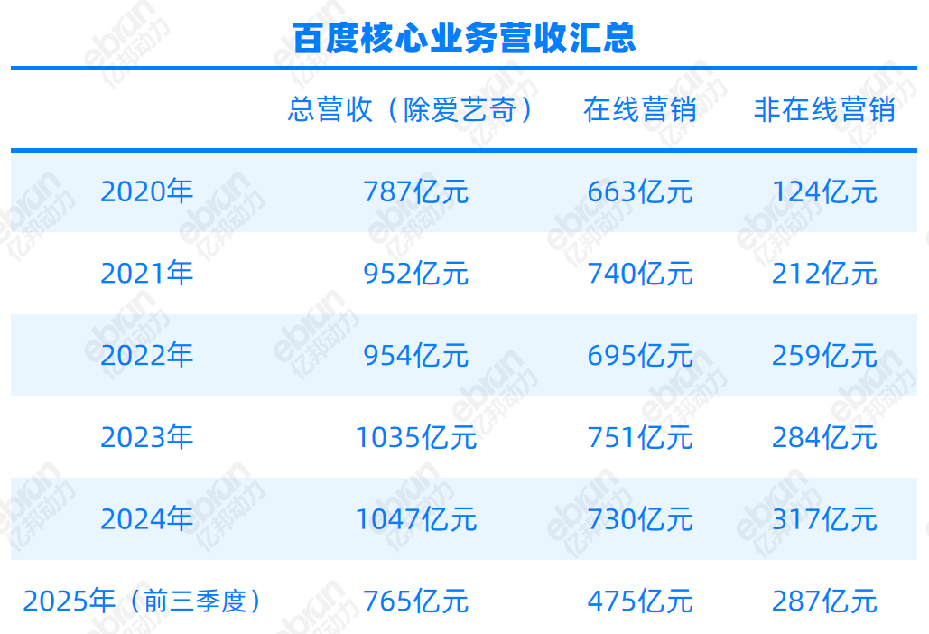 2025年第三季度,百度营收312亿元,同比下滑7%;核心业务营收247亿元,同比下滑7%;调整后的季度净利润37.7亿元,同比下滑35.9%。其中在线营销营收157亿元,同比下滑18%,已连续6个季度下滑,跌幅呈扩大趋势(Q1下滑6%,Q2下滑15%)。与之相对,QuestMobile数据显示,2025年Q3互联网广告市场规模1875.1亿元,同比增长6.4%。