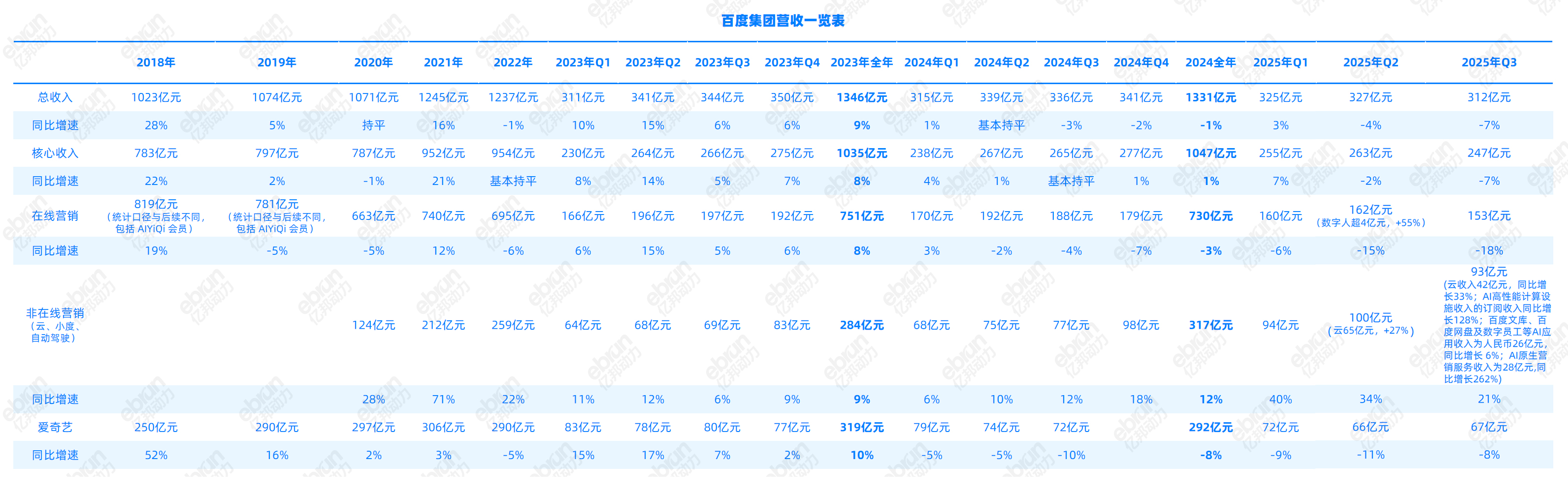 拉长时间线可以看到,百度自2018年营收突破千亿后,增速显著放缓,甚至出现小幅波动。收入结构高度依赖在线营销,2024年广告收入占比仍高达54.8%。