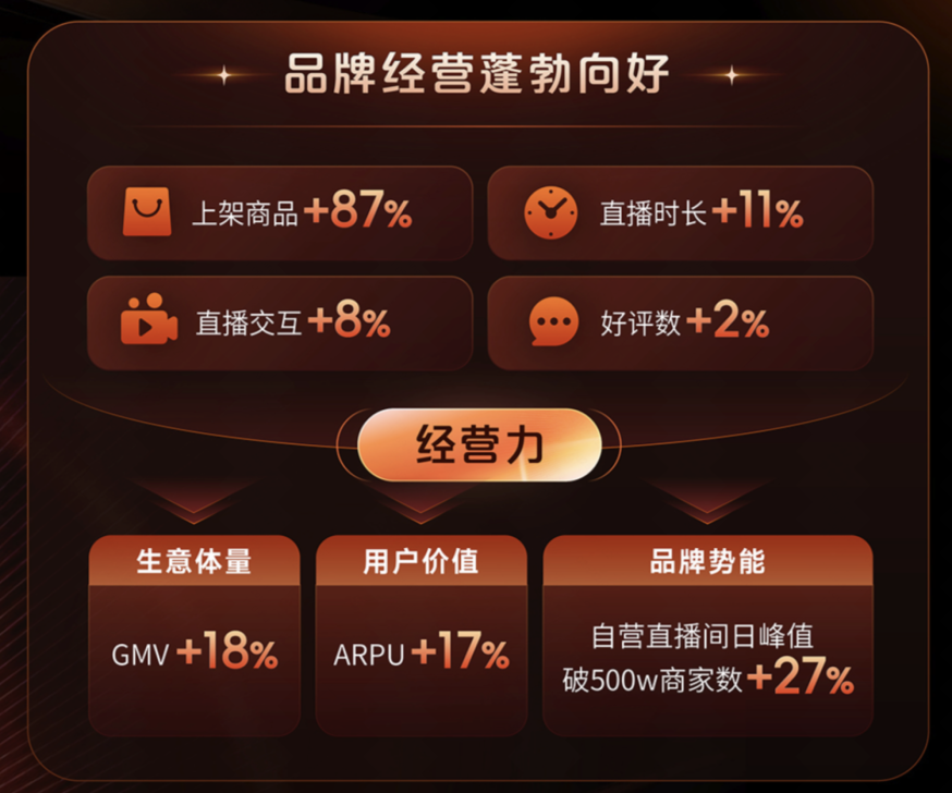 种种数据表明,快手确实是当下最有资格谈“营销效率”的玩家之一:在品牌商家层面,快手上架商品同比增长87%,直播时长同比增长11%,直播交互同比增长8%,最能体现用户商业价值的ARPU(每用户平均收入)同比增长17%。